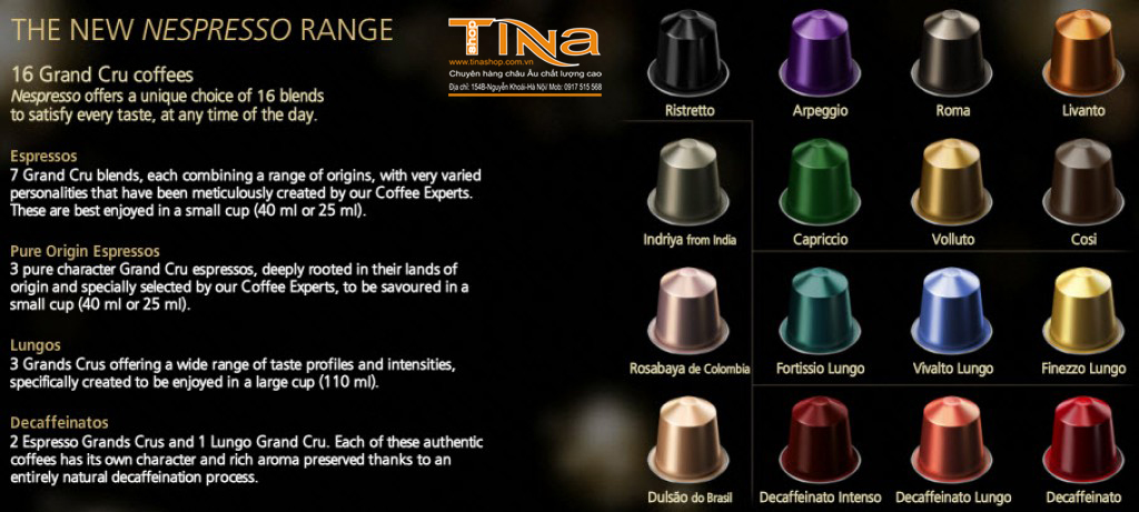 Viên nén cafe Nespresso được bán độc quyền bởi Nespresso gồm 16 vị "Gran Cru", được pha trộn một cách tinh tế giữa 2 loại cafe: Arabica và Robusta.
